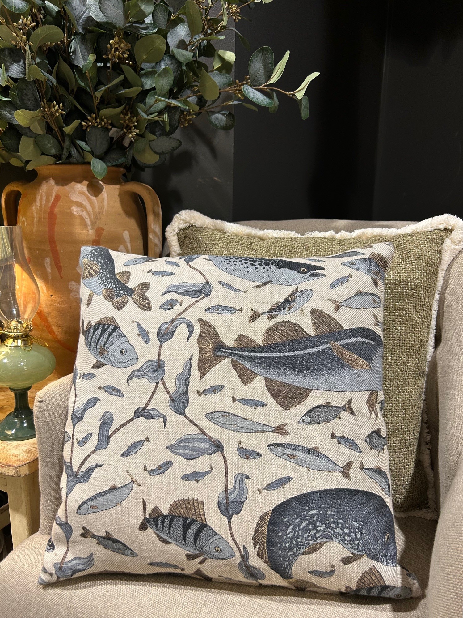 Kuddfodral i 100 % linne i storlek 50 x 50 cm. Kuddfodralet tillverkas i Hälsingland och har en unik handritad mönsterdesign i miljöcertifierade material.