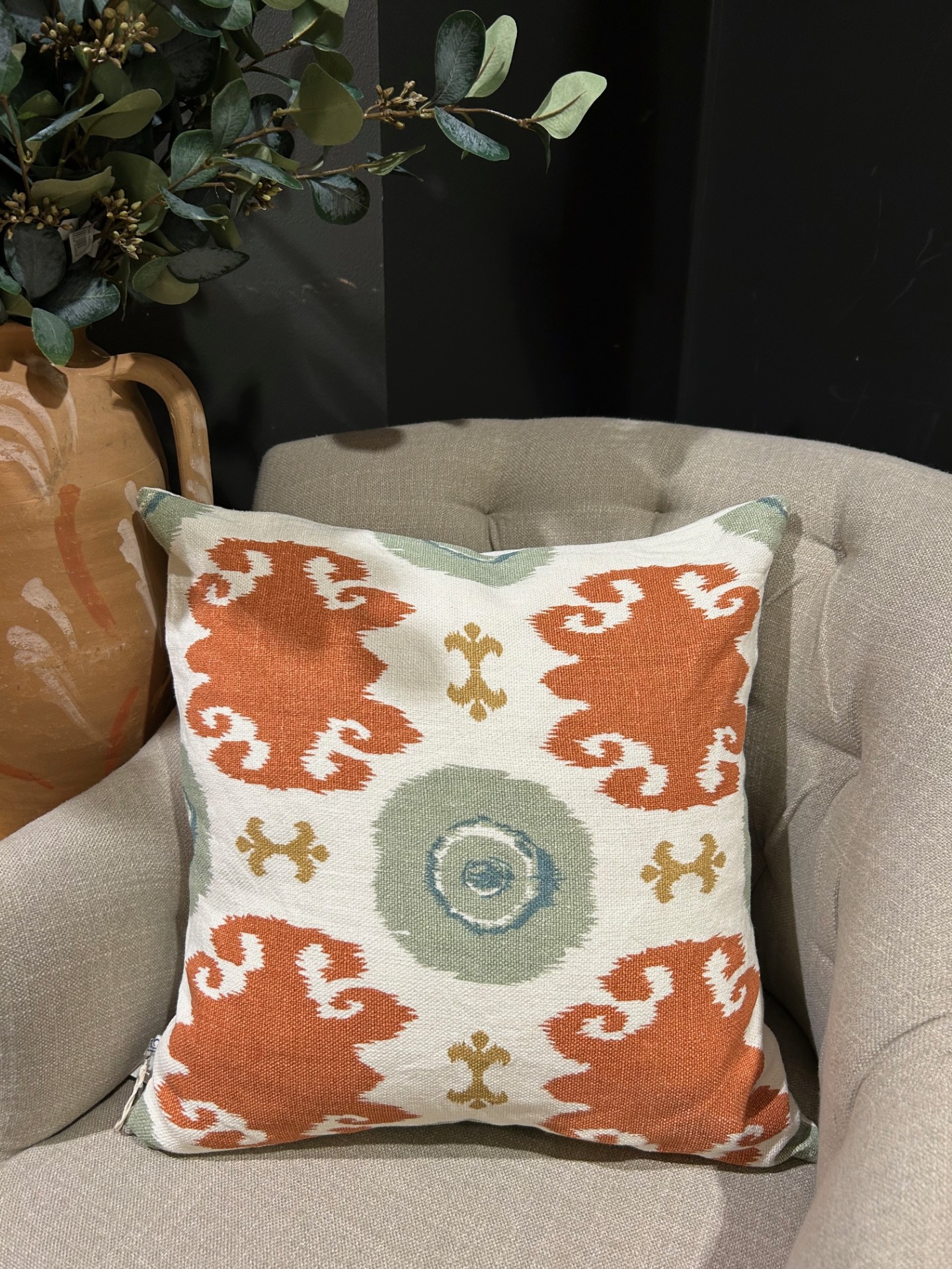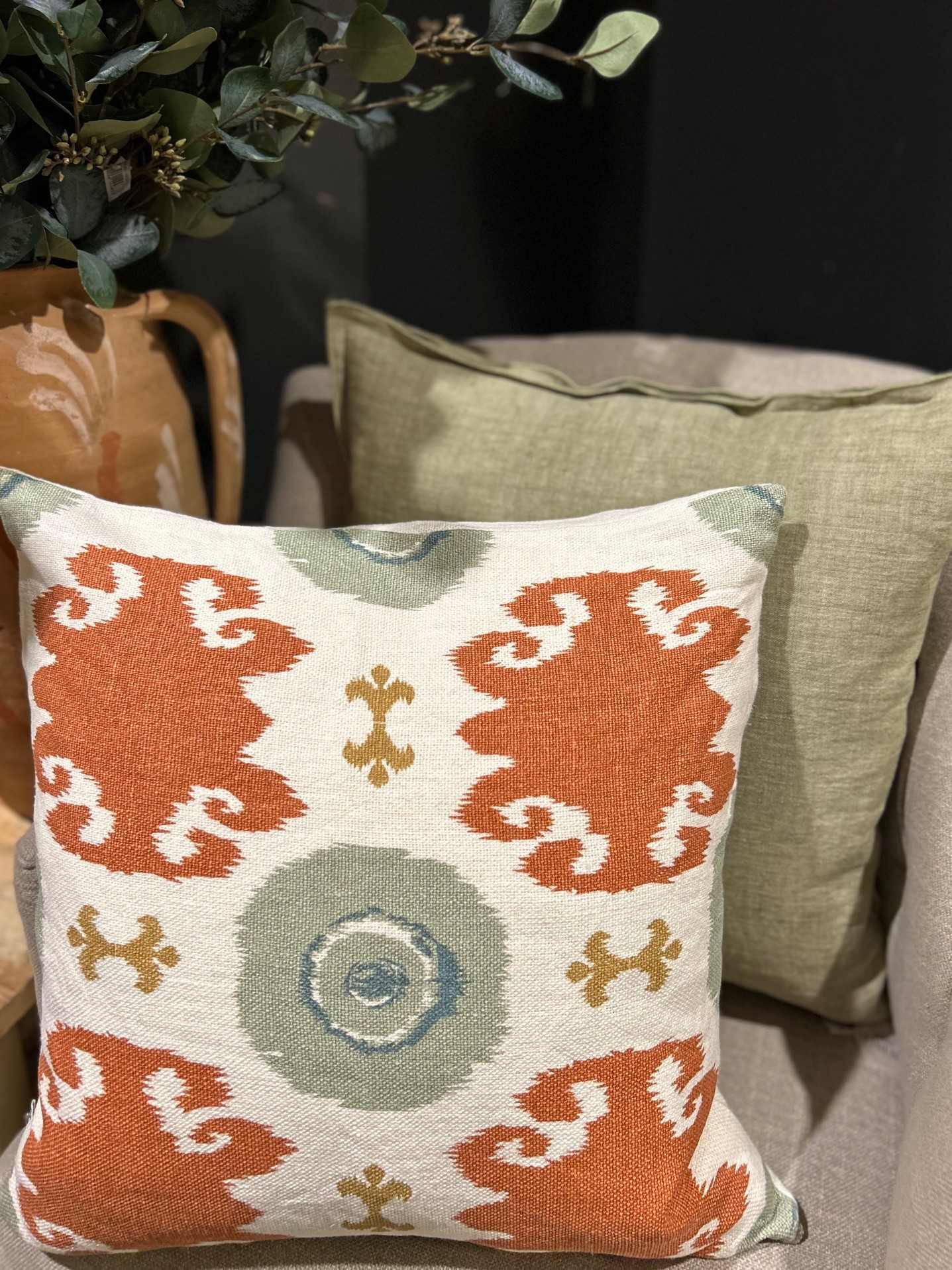 Mahal är ett handtryckt kuddfodral i linne med ett etniskt inspirerat mönster med enfärgad baksida.Sobra färger som enkelt kan matchas med andra mönstrade kuddar och/eller enfärgade linnekuddar och jättefin till våra tibetanska fårskinnskuddar.