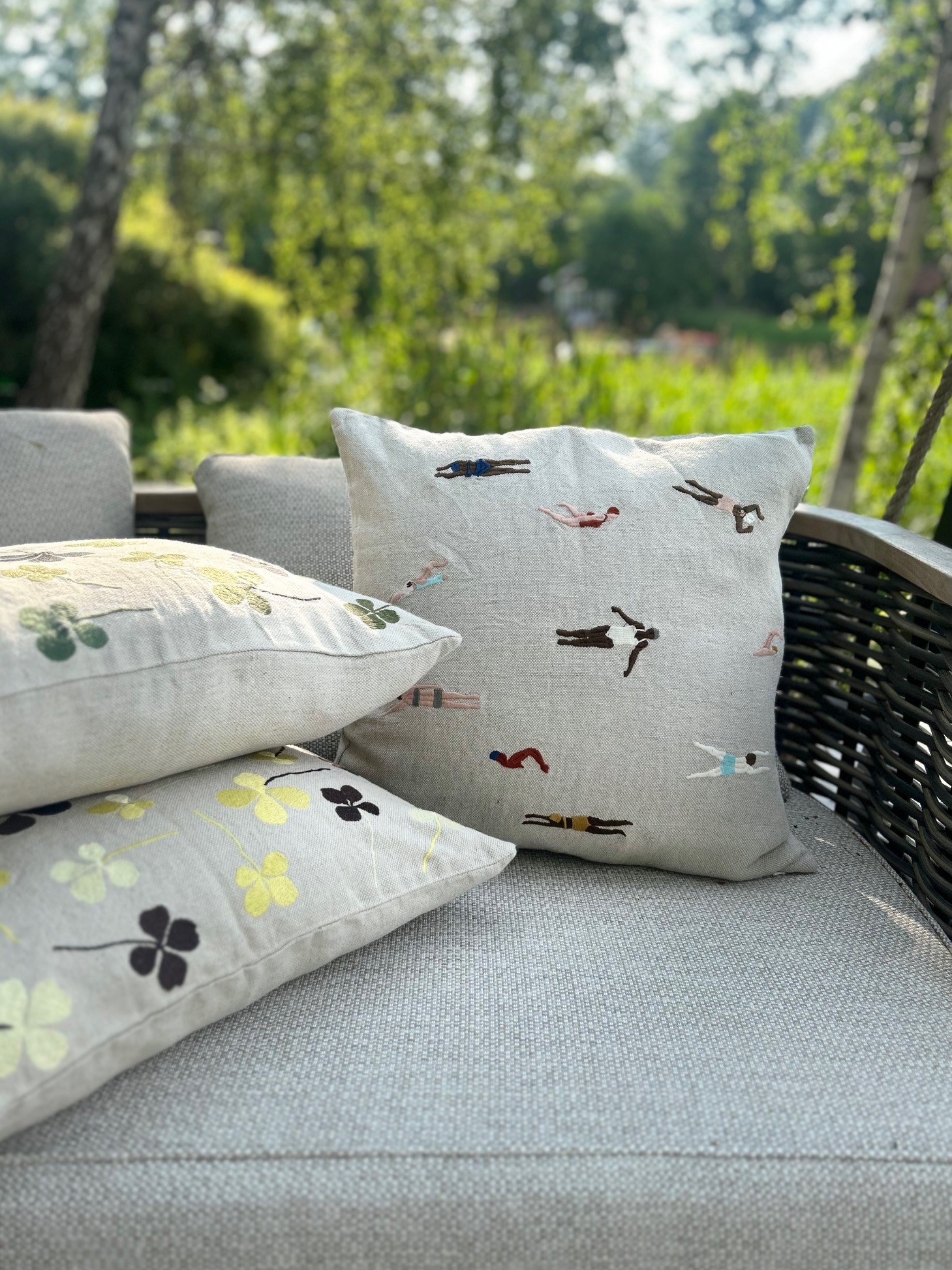 Kuddfodral i mjuk kraftig oblekt linnekanvas med broderat motiv. Oavsett väder vill vi hoppa i!