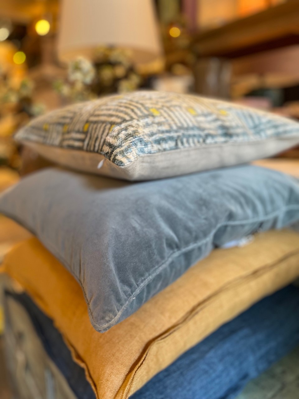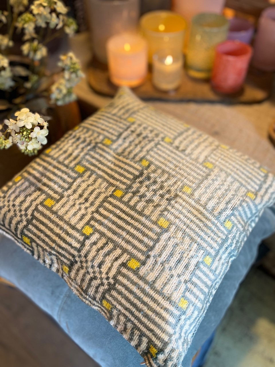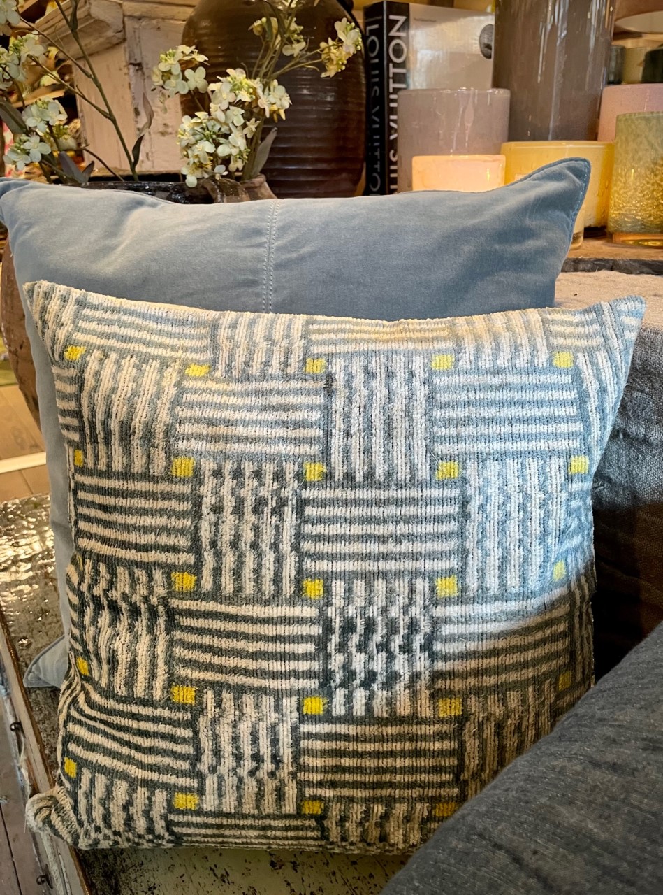 Handvävd vacker kudde i sammet/siden. Eftersom detta är en handgjord kudde så blir ingen exakt lika ut och kan därför skilja sig lite från bilden i mönstret. Baksidan är i ett neutralt offwhite canvas tyg.