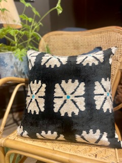 Handvävd vacker kudde i sammet/siden. Eftersom detta är en handgjord kudde så blir ingen exakt lika ut och kan därför skilja sig lite från bilden i mönstret. Baksidan är i ett neutralt offwhite canvas tyg.