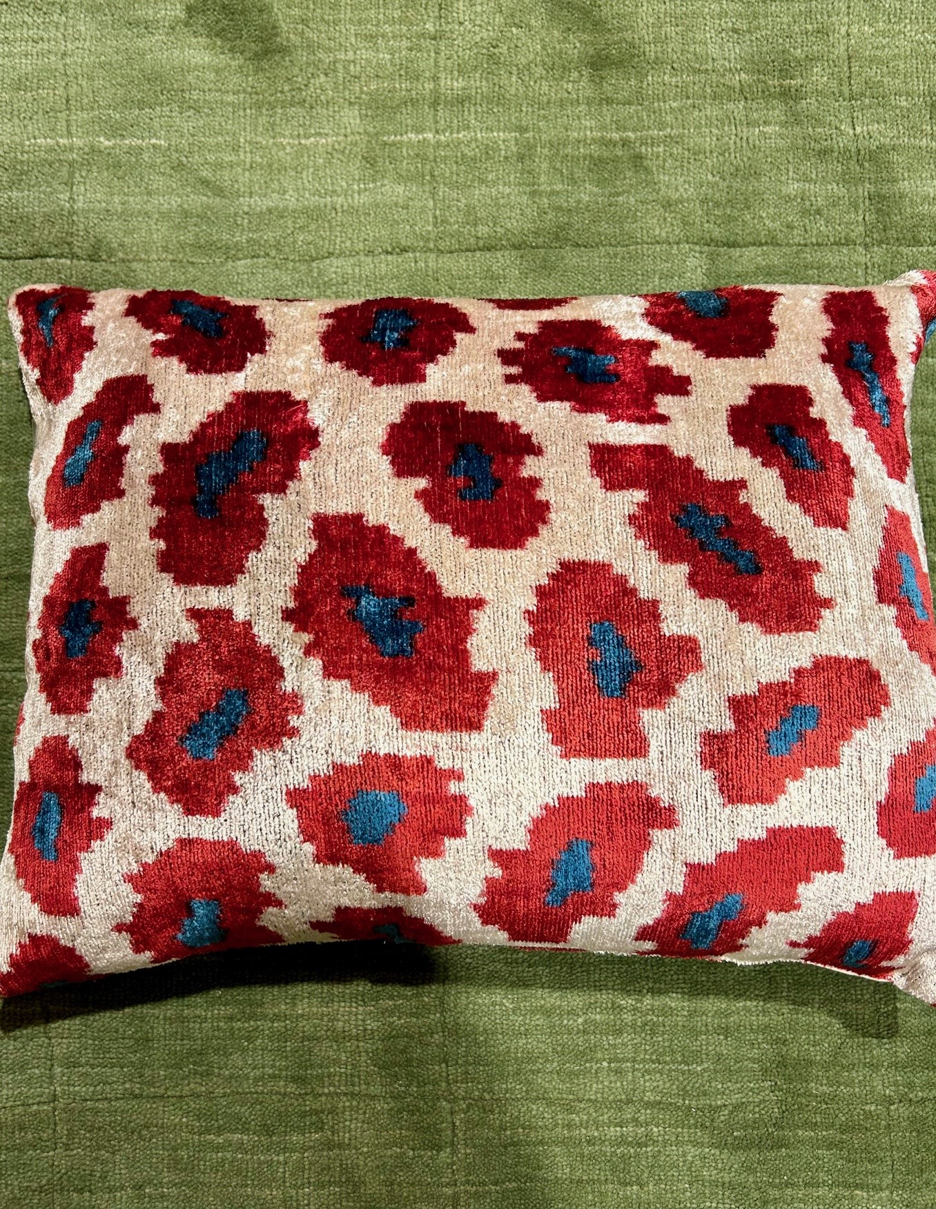 Handvävd vacker kudde i sammet/siden. Eftersom detta är en handgjord kudde så blir ingen exakt lika ut och kan därför skilja sig lite från bilden i mönstret. Baksidan är i ett neutralt offwhite canvas tyg.