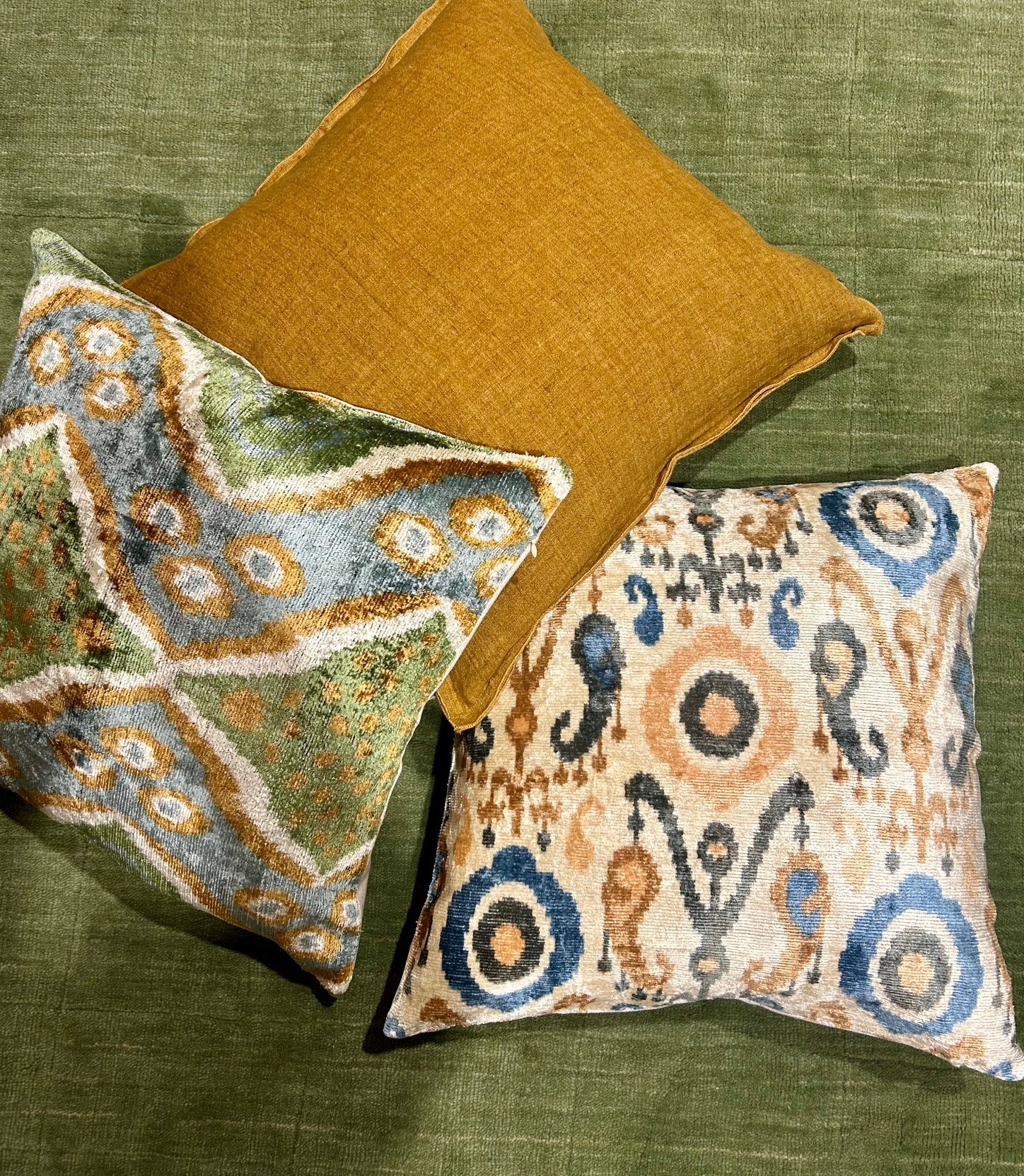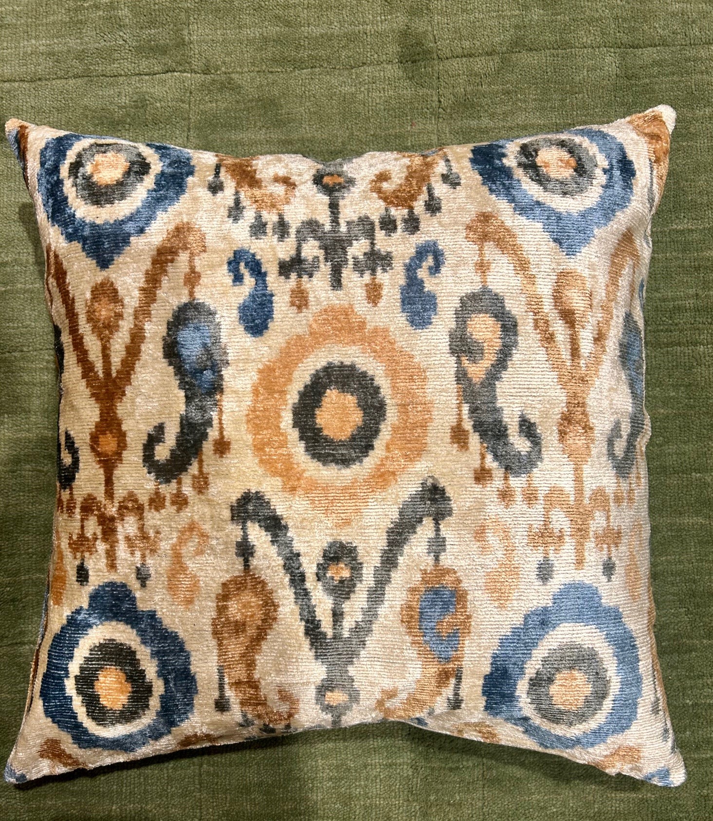 Handvävd vacker kudde i sammet/siden. Eftersom detta är en handgjord kudde så blir ingen exakt lika ut och kan därför skilja sig lite från bilden i mönstret. Baksidan är i ett neutralt offwhite canvas tyg.
