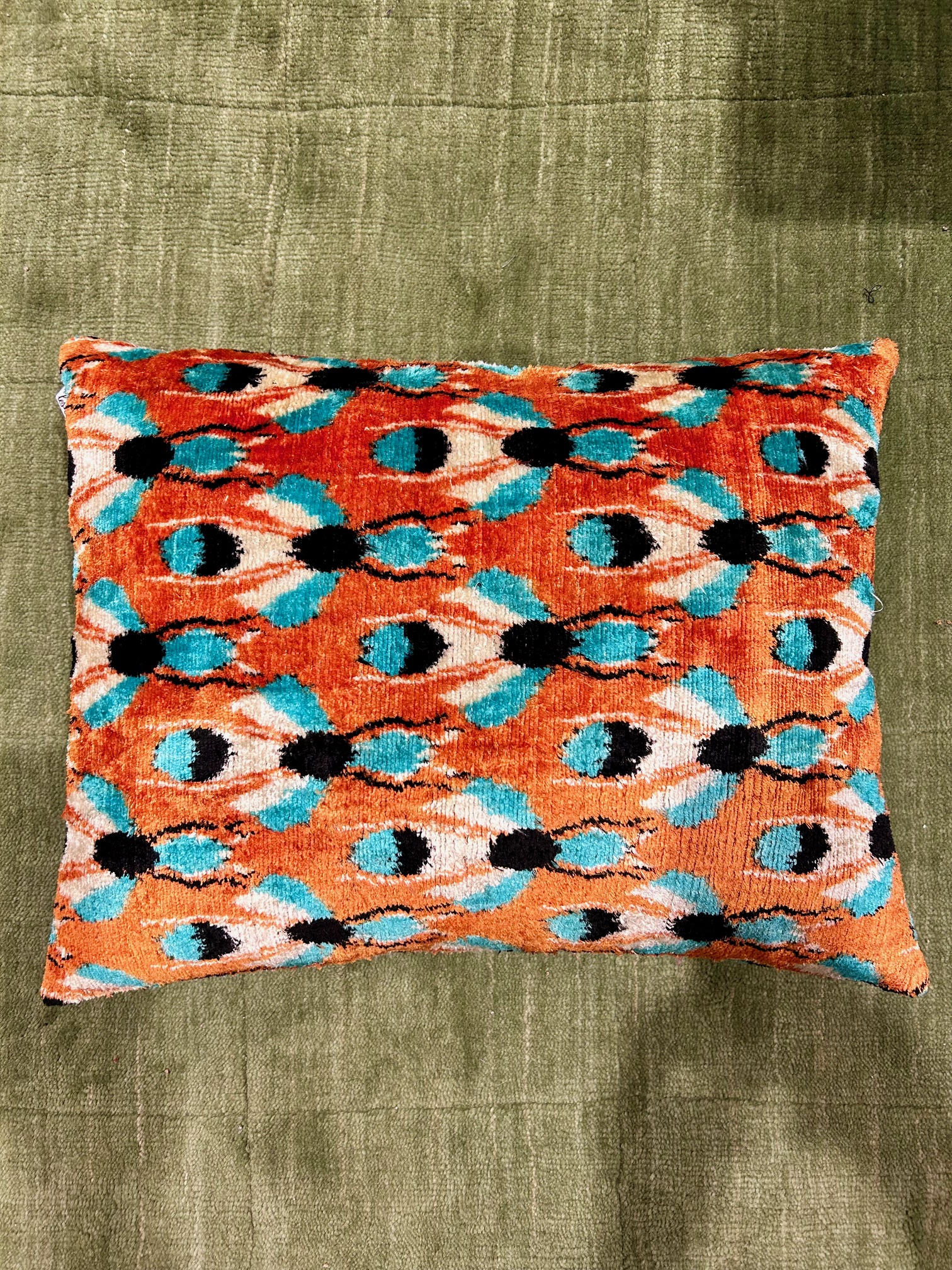 Handvävd vacker kudde i sammet/siden. Eftersom detta är en handgjord kudde så blir ingen exakt lika ut och kan därför skilja sig lite från bilden i mönstret. Baksidan är i ett neutralt offwhite bomulls tyg.