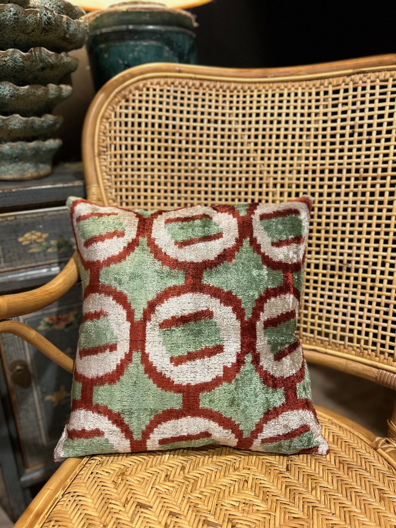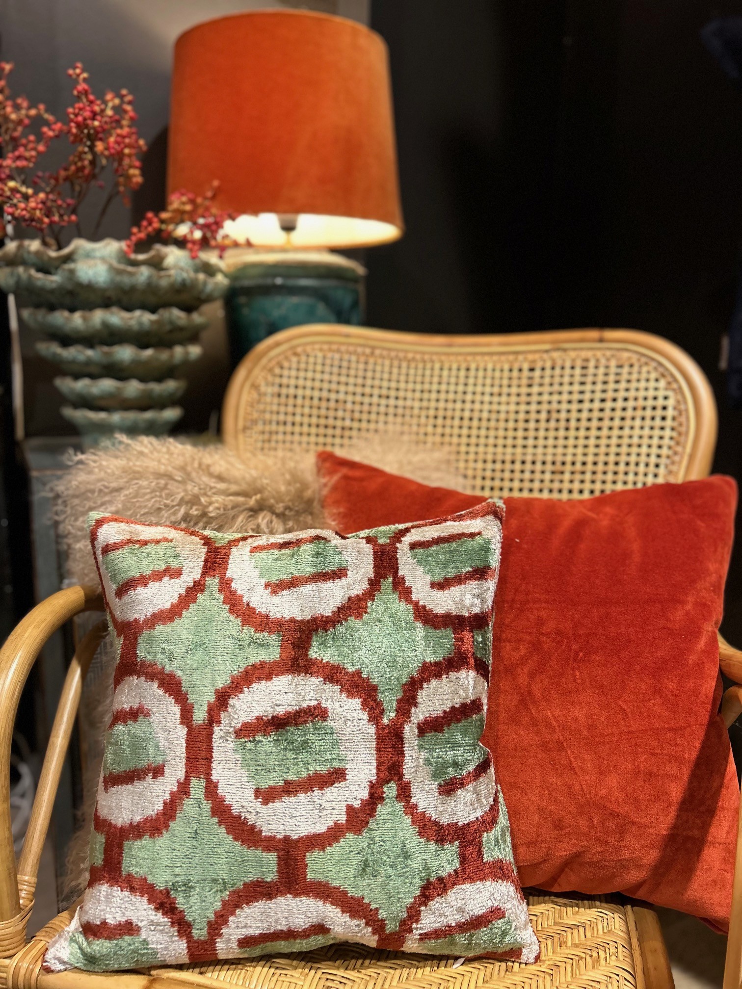 Handvävd vacker kudde i sammet/siden. Eftersom detta är en handgjord kudde så blir ingen exakt lika ut och kan därför skilja sig lite från bilden i mönstret. Baksidan är i ett neutralt offwhite bomulls tyg.