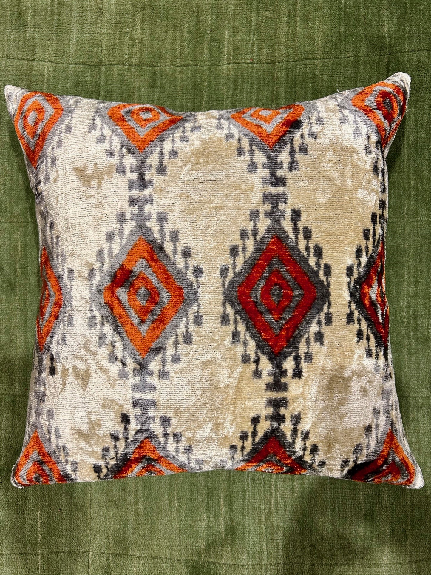 Handvävd vacker kudde i sammet/siden. Eftersom detta är en handgjord kudde så blir ingen exakt lika ut och kan därför skilja sig lite från bilden i mönstret. Baksidan är i ett neutralt offwhite bomulls tyg.