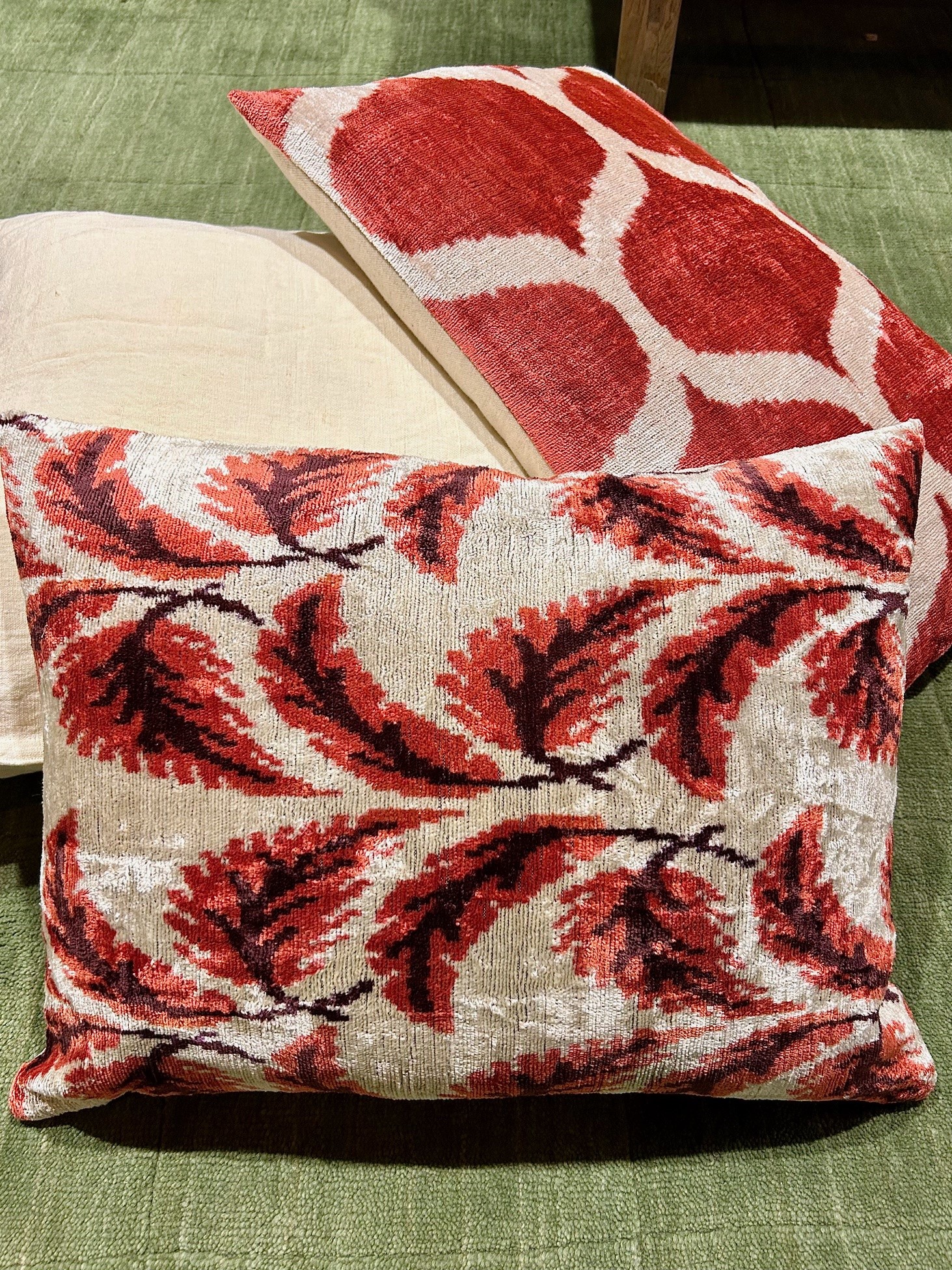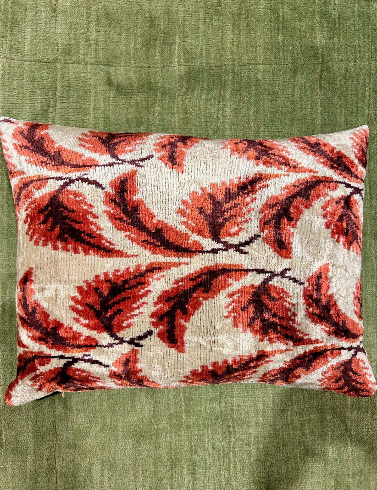 Handvävd vacker kudde i sammet/siden. Eftersom detta är en handgjord kudde så blir ingen exakt lika ut och kan därför skilja sig lite från bilden i mönstret. Baksidan är i ett neutralt offwhite bomulls tyg.