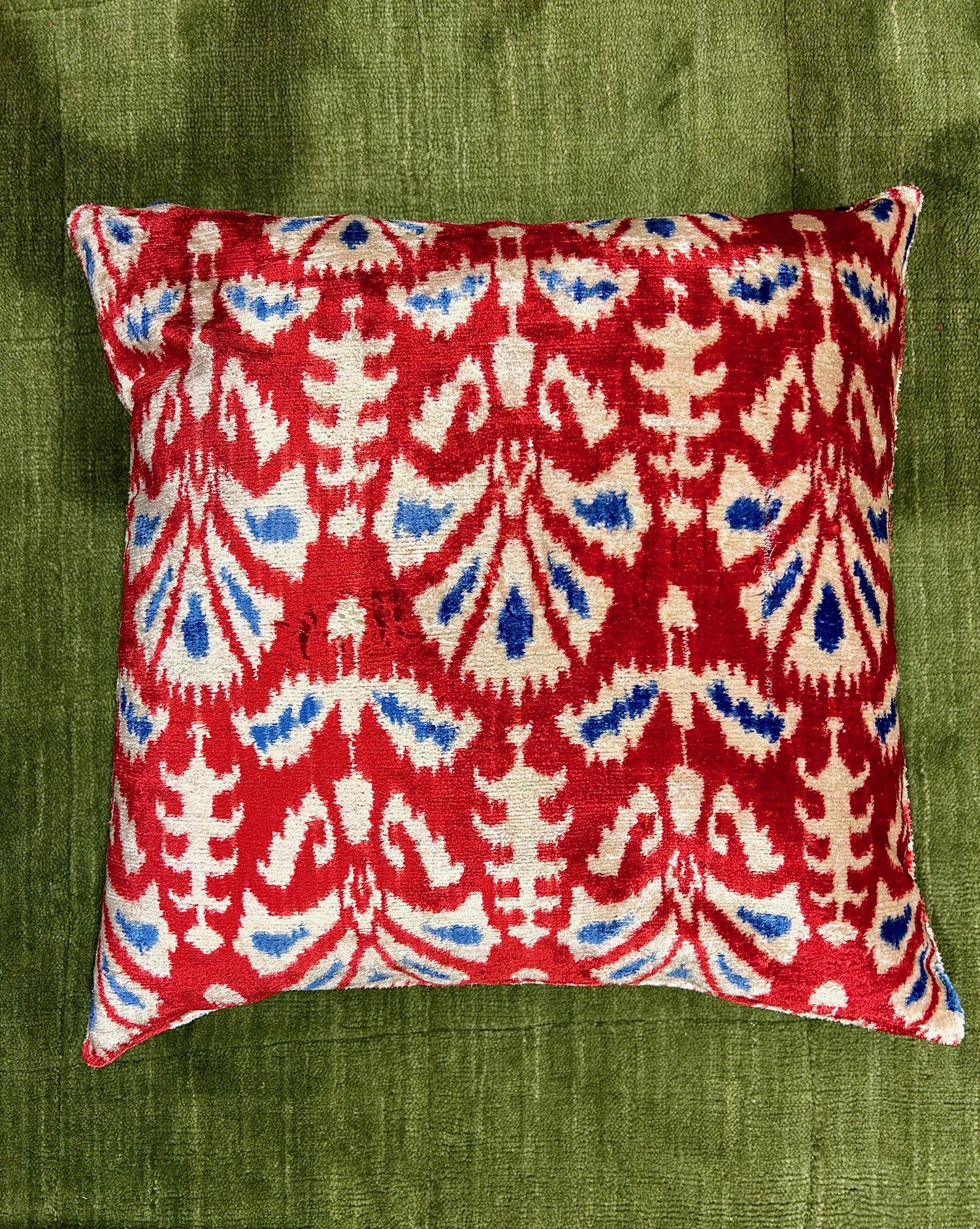 Handvävd vacker kudde i sammet/siden. Eftersom detta är en handgjord kudde så blir ingen exakt lika ut och kan därför skilja sig lite från bilden i mönstret. Baksidan är i ett neutralt offwhite bomulls tyg.