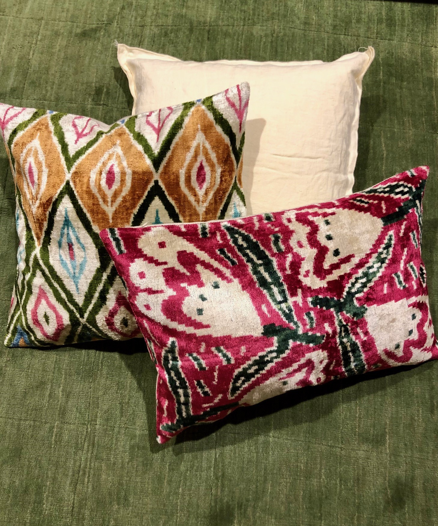 Handvävd vacker kudde i sammet/siden. Eftersom detta är en handgjord kudde så blir ingen exakt lika ut och kan därför skilja sig lite från bilden i mönstret. Baksidan är i ett neutralt offwhite bomulls tyg.