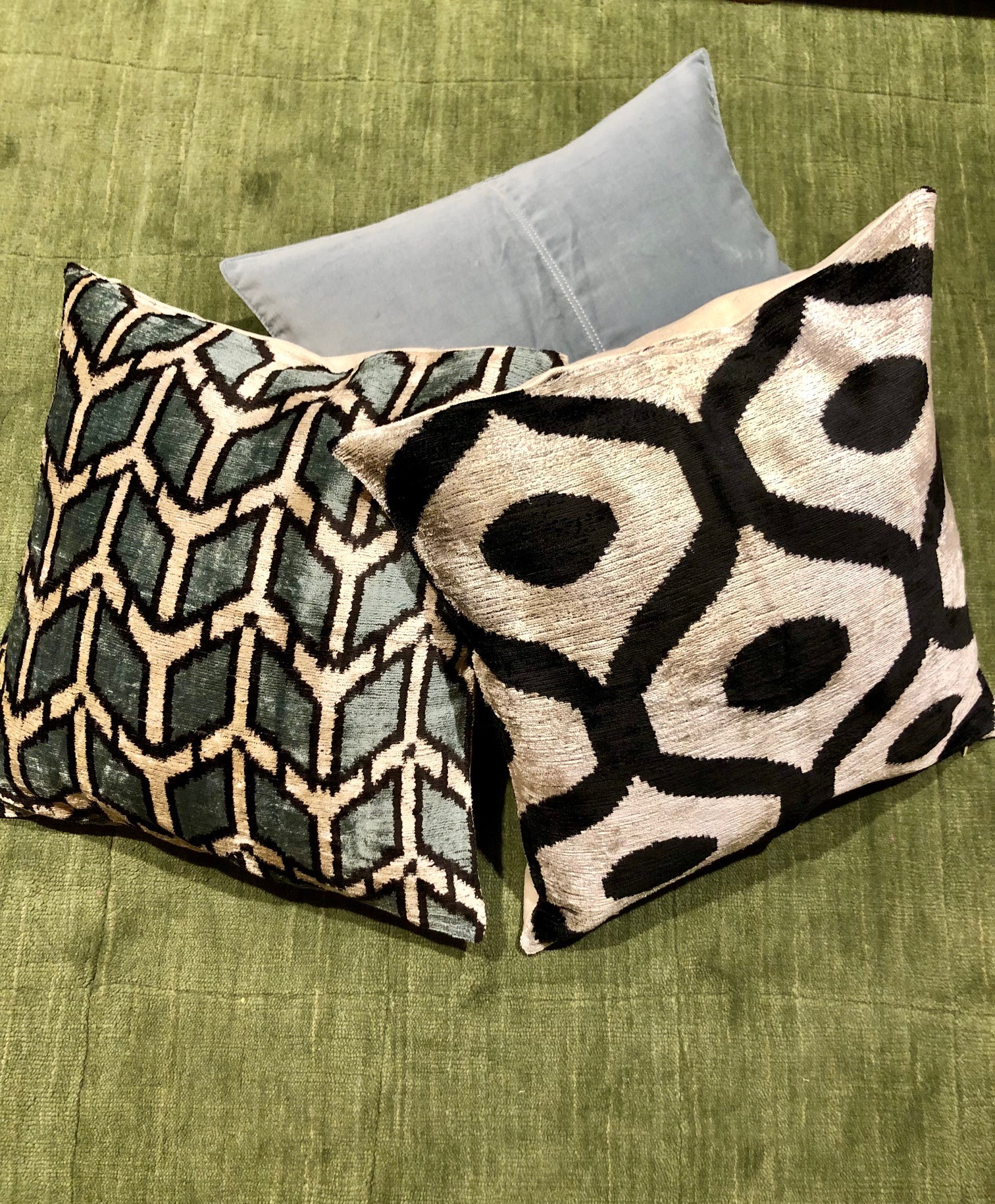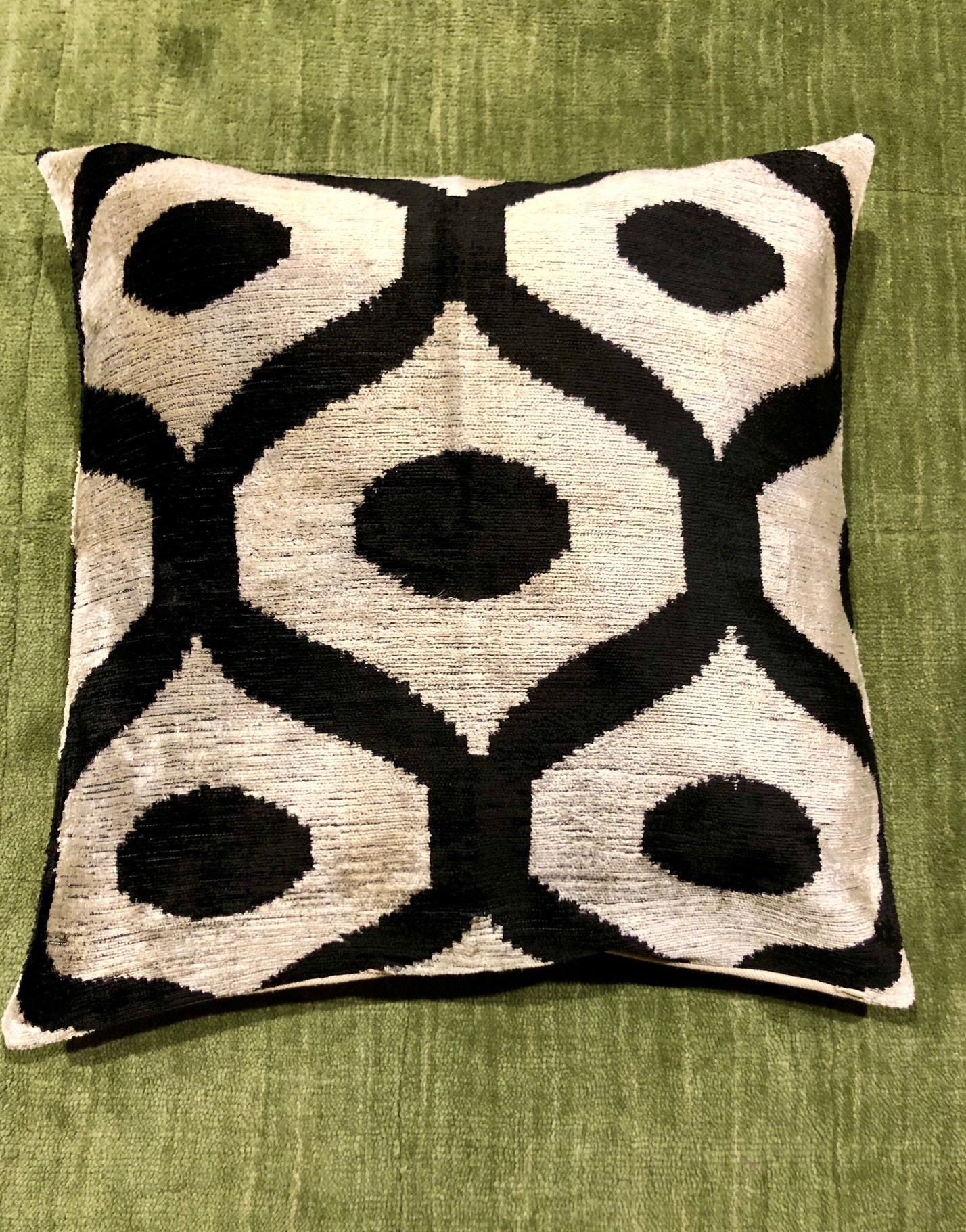 Handvävd vacker kudde i sammet/siden. Eftersom detta är en handgjord kudde så blir ingen exakt lika ut och kan därför skilja sig lite från bilden i mönstret. Baksidan är i ett neutralt offwhite bomulls tyg.